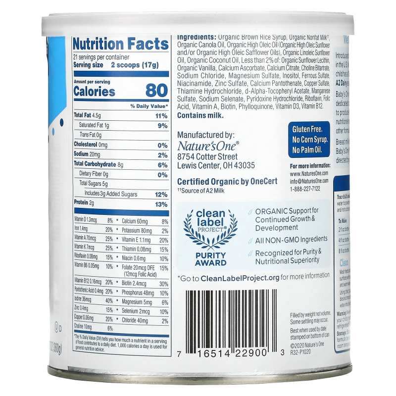 Nature's One понимает, что грудное молоко является лучшим источником питания, которое может дать мать для своего ребенка в первый год его жизни, оно обладает теми преимуществами, которых нет ни в одной формуле. Таким образом, Baby's Only Organic не предназначен для детей в возрасте до 1 года, если это не предписано Вашим лечащим врачом.
