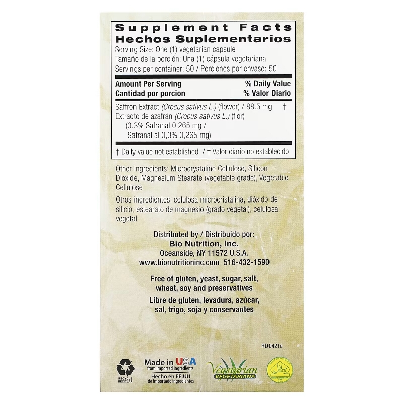 Bio Nutrition Экстракт шафрана 50 капсул на растительной основе