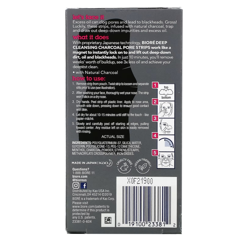 Компоненты добавки Biore, Полоски с углем для глубокого очищения пор, 18 полосок для носа