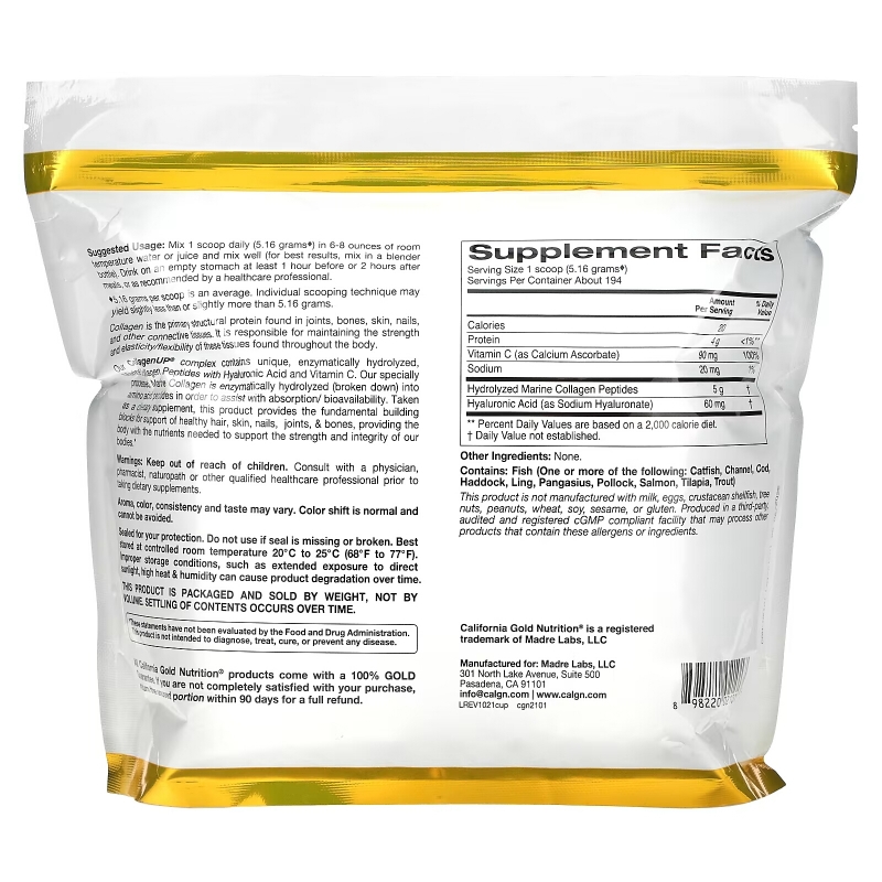 California Gold Nutrition, CollagenUP, Hydrolyzed Marine Collagen Peptides with Hyaluronic Acid and Vitamin C, Unflavored, 2.2 lbs (1 kg)