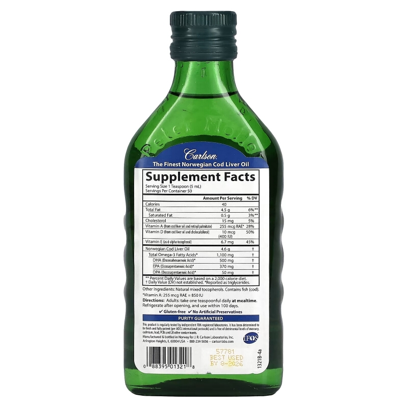 Описание добавки Carlson, Жир печени дикой норвежской трески, 250 мл (8,4 жидк. Унции)