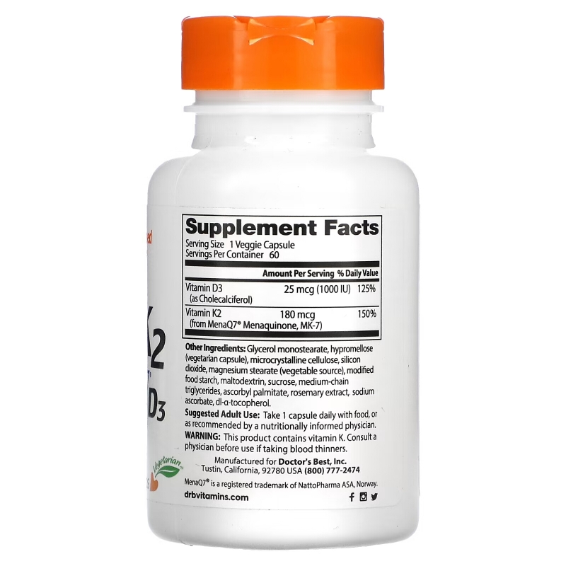 Купить Doctor's Best, натуральный витамин K2 MK-7 с MenaQ7 и витамином D3, 180 мкг, 60 вегетарианских капсул – цена 4250 ₽, заказать с доставкой в Челябинск | Интернет-магазин chelyabinsk.fakeoff.ru