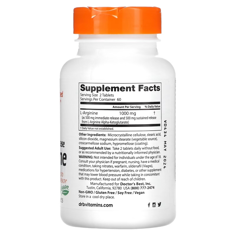 Doctor's Best, L-аргинин с длительным высвобождением и немедленным высвобождением, 500 мг, 120 таблеток с двойным слоем