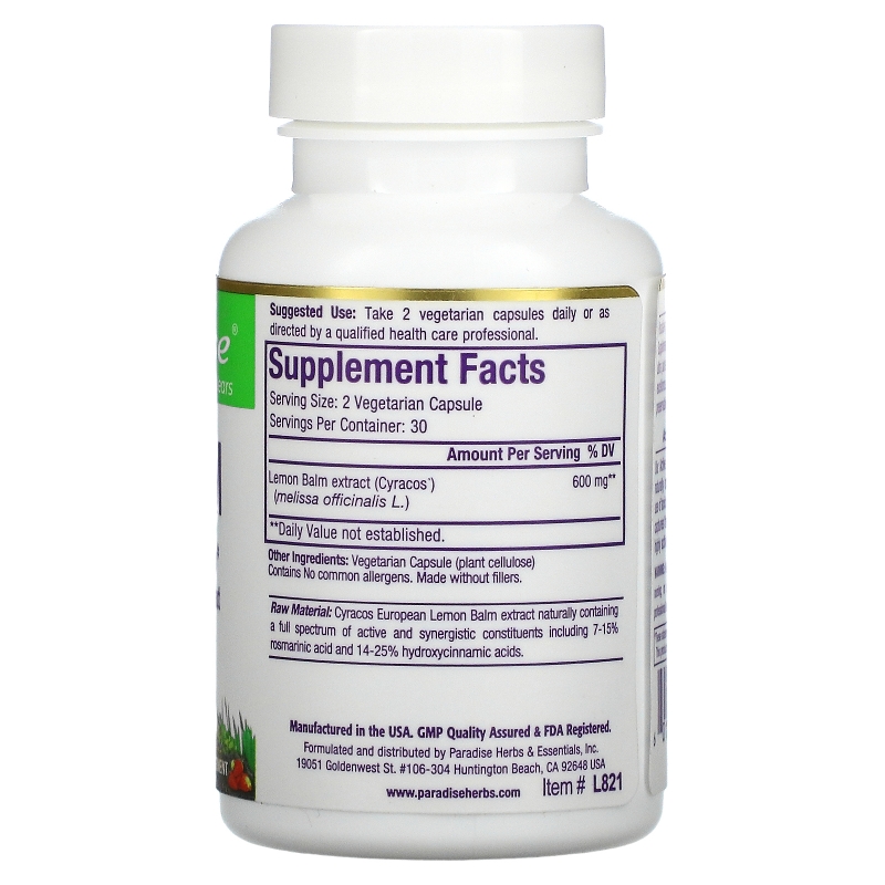 Компоненты добавки Paradise Herbs, Европейская мята лимонная, 60 вегетарианских капсул