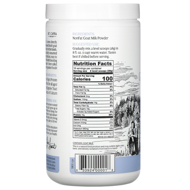 CapraMilk это вкусный сливочный порошок козьего молока. Этот продукт гомогенизирован натуральным образом и вызывает меньший риск появления аллергических реакций, чем коровье молоко. CapraMilk это отличный источник кальция, и не содержит пестицидов, гербицидов, гормонов роста и антибиотиков.