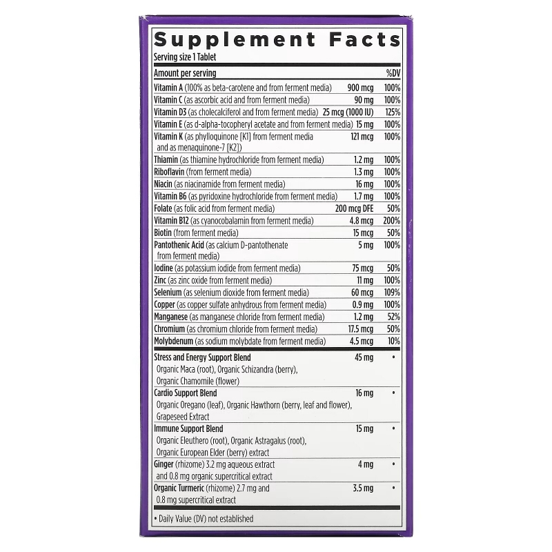 • Суточная доза не определена ‡ Литотамнион: (L. calcareum и L. coralloides) † Питательные вещества и травы культивируют в органических средах, которые могут содержать: органическую молотую сою, Saccharomyces cerevisiae (органические дрожжи: активные и неактивные), органический мальтодекстрин, органическую аравийскую камедь, органическую апельсиновую кожуру, органическую кожуру лимона, органический морковный порошок, органический порошок люцерны , Lactobacilli (L. acidophilus, L. bifidus, L. rhamnosus) и ферменты (дезактивированные). |