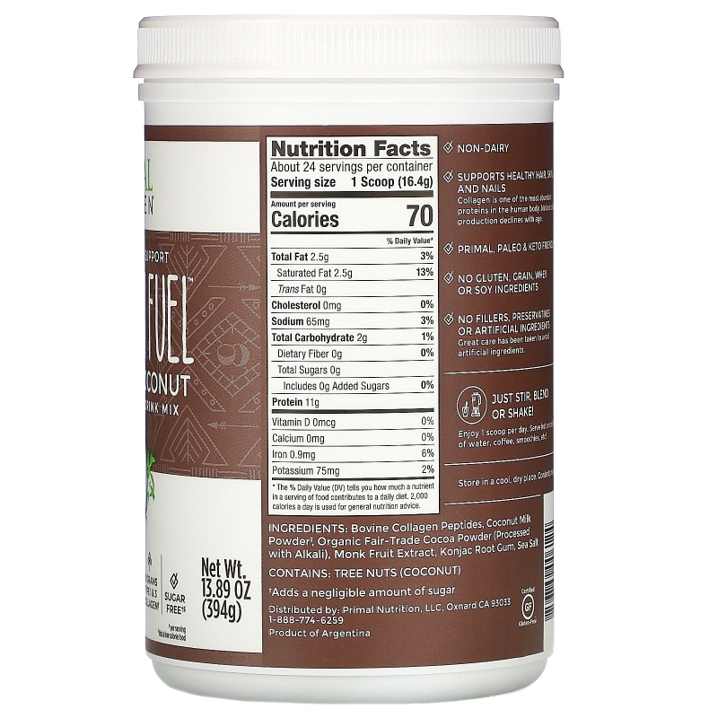 Купить Primal Kitchen, Питьевая смесь с пептидами коллагена от животных травяного откорма, коллагеновое топливо, шоколад и кокос, 394 г (13,9 ж. унц.) – цена 6190 ₽, заказать с доставкой в Челябинск | Интернет-магазин chelyabinsk.fakeoff.ru