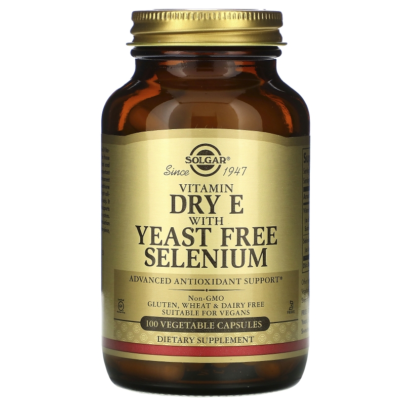 Solgar, Сухой витамин E с селеном без дрожжей, 100 вегетарианских капсул