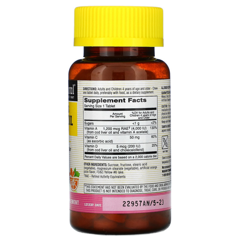 Описание добавки Mason Natural, Жир печени трески Healthy Kids, жевательные конфеты с витамином D, искусственный ароматизатор для апельсинового вкуса, 100 конфет